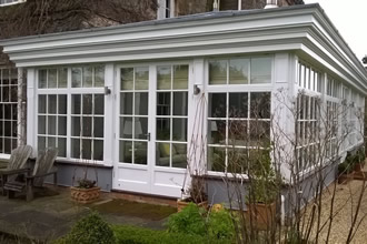 This is a conservatory in Windmerpool, steel frame clad in softwood then painted.