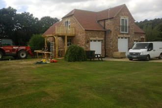 Sun balcony, construction of Romeo and Juliet balcony and view out of bedroom to unfinished Romeo and Juliet balcony. - A sun balcony, Old wood Skellingthorpe made on site from green oak.