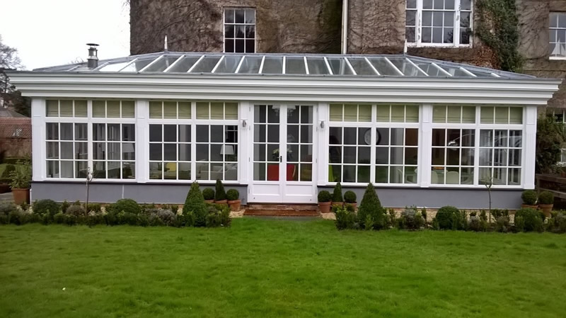 This is a conservatory in Windmerpool, steel frame clad in softwood then painted.