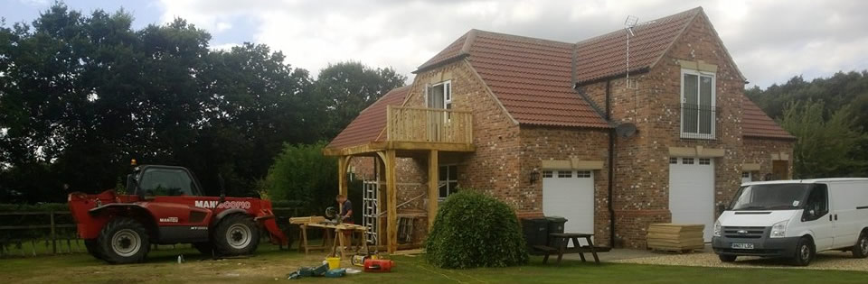 Sun balcony, construction of Romeo and Juliet balcony and view out of bedroom to unfinished Romeo and Juliet balcony. - A sun balcony, Old wood Skellingthorpe made on site from green oak.